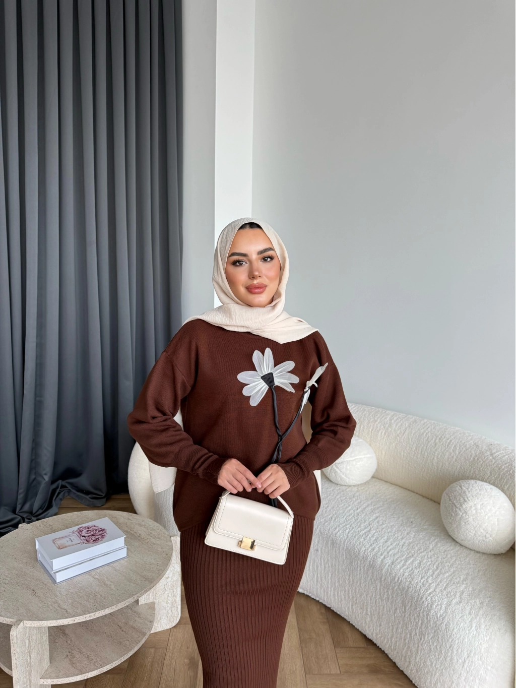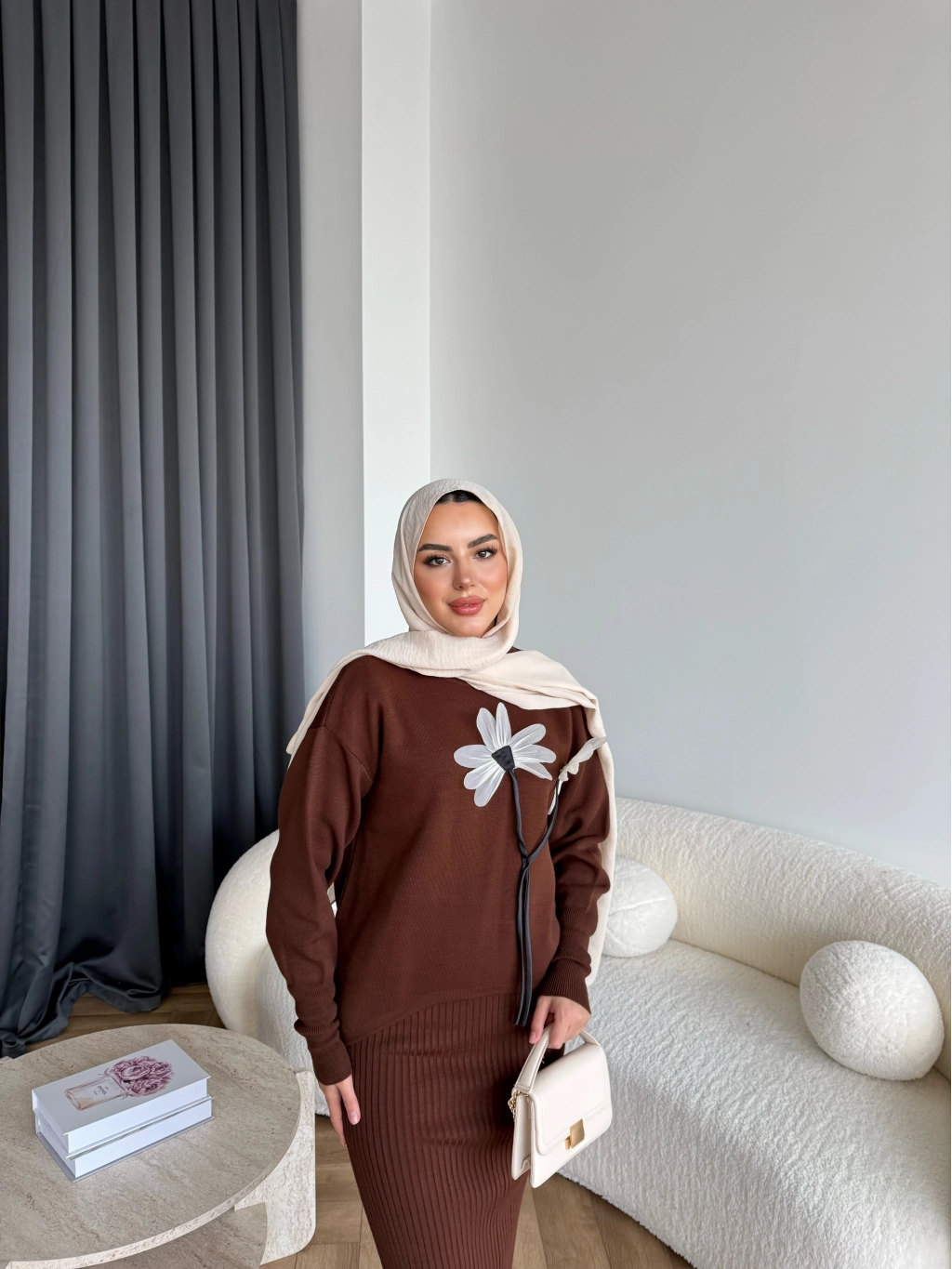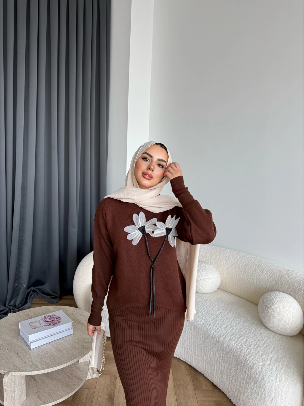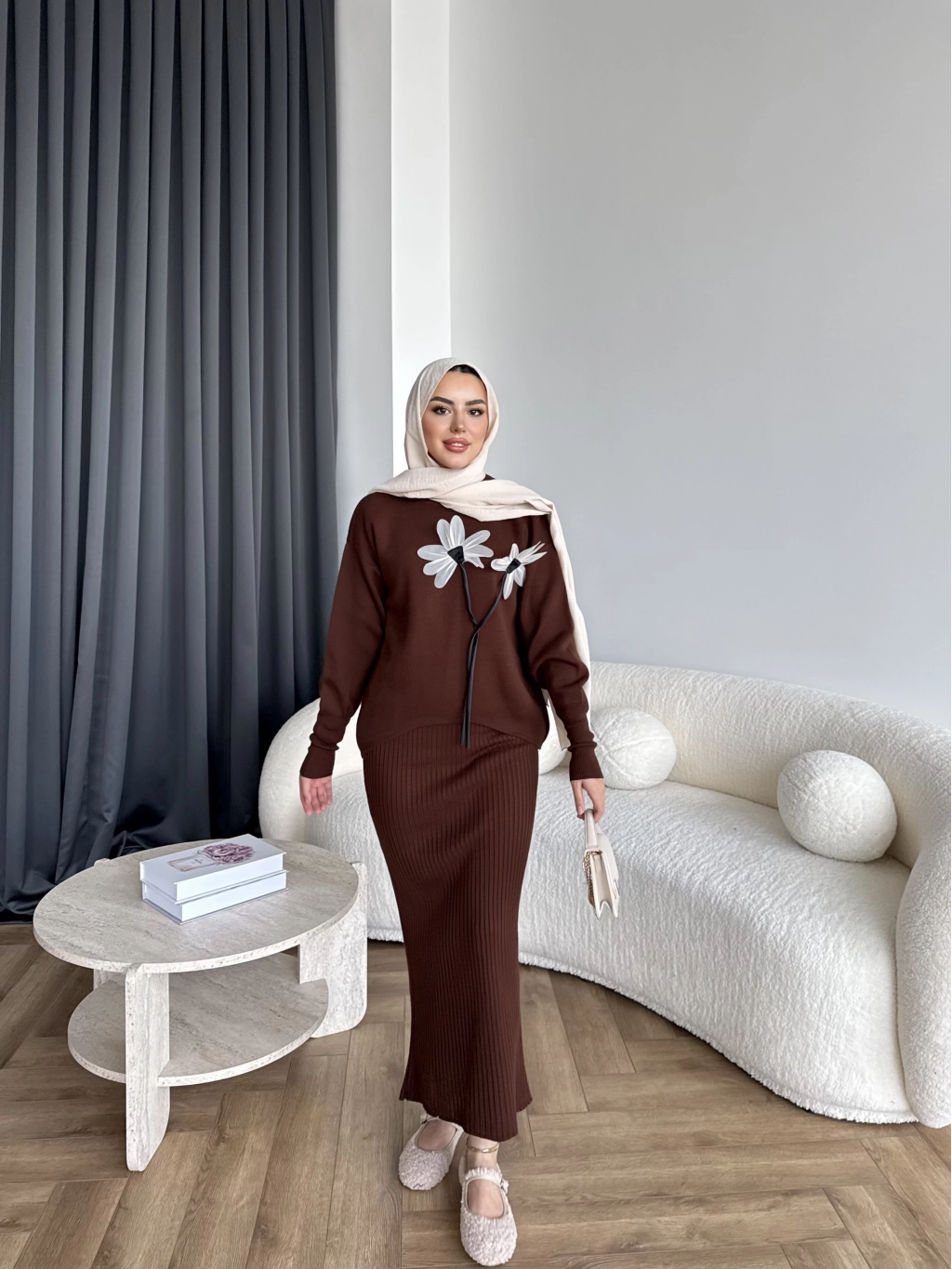 Pls-Çiçek Detay Jile Elbise - Kahve