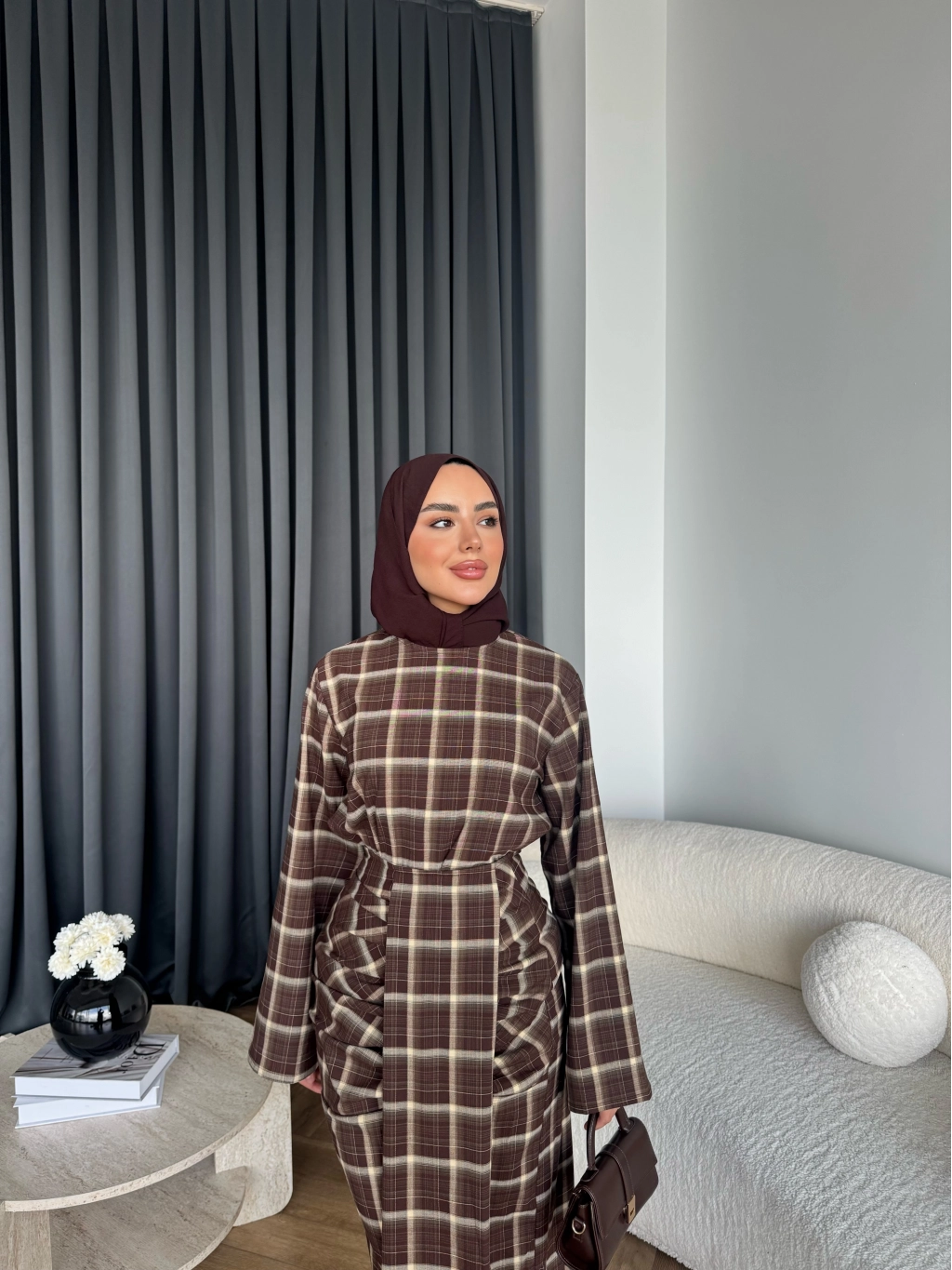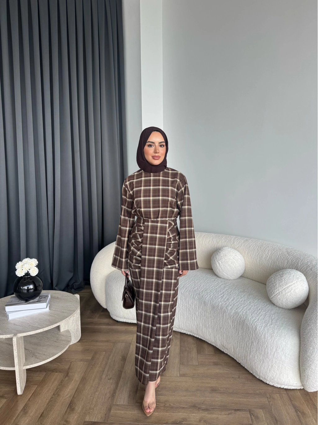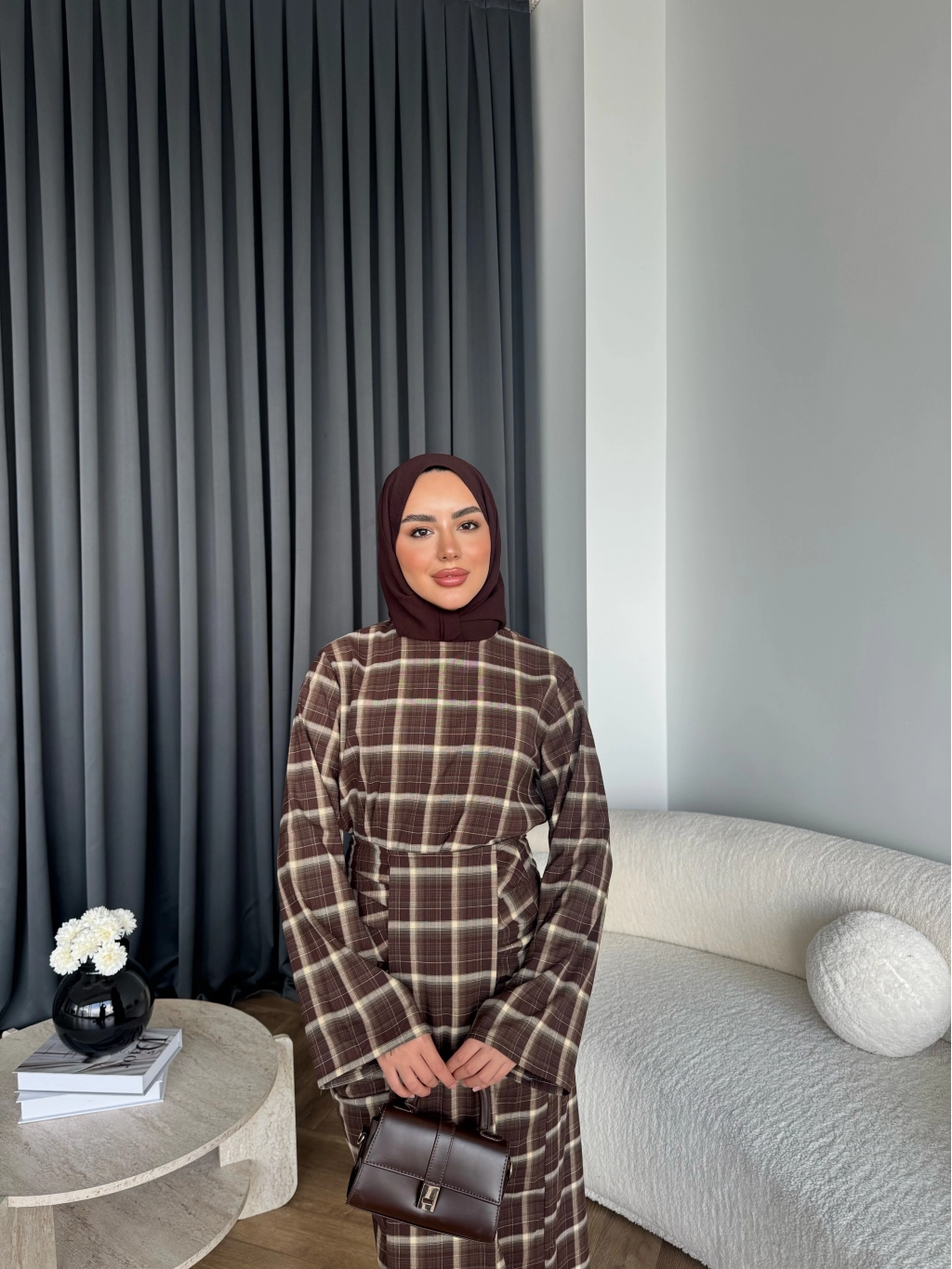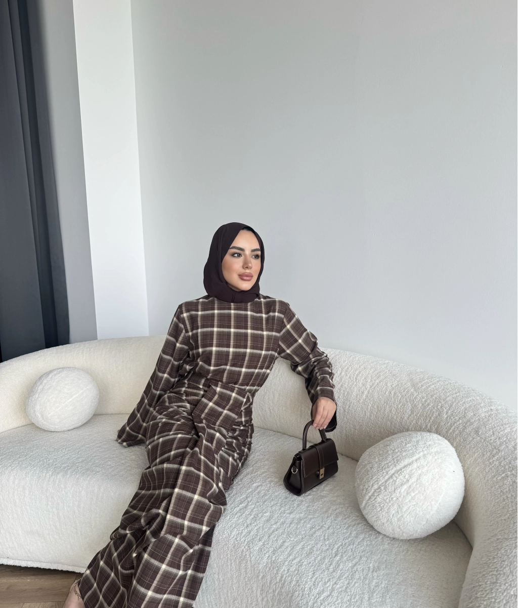 Qu - Carmen Kareli Etekli Takım - Koyu Kahve
