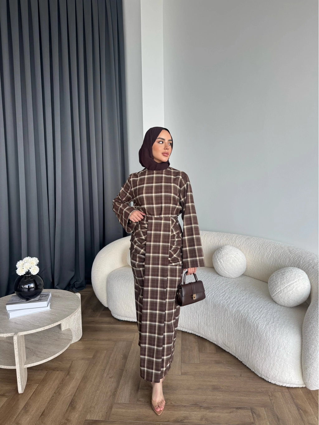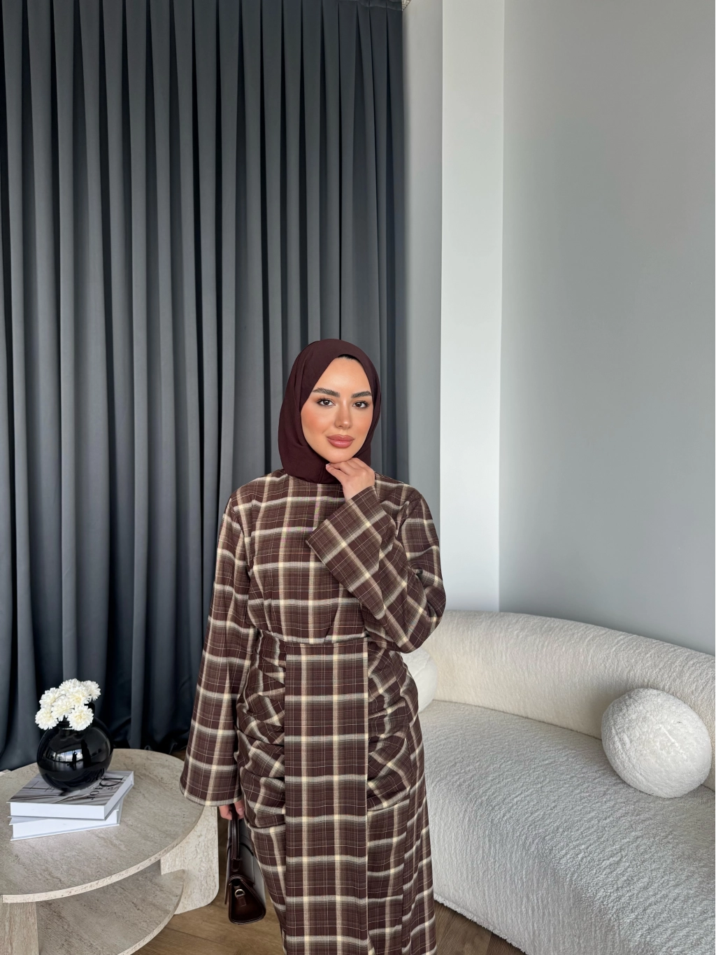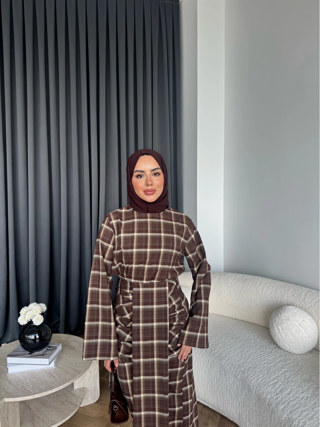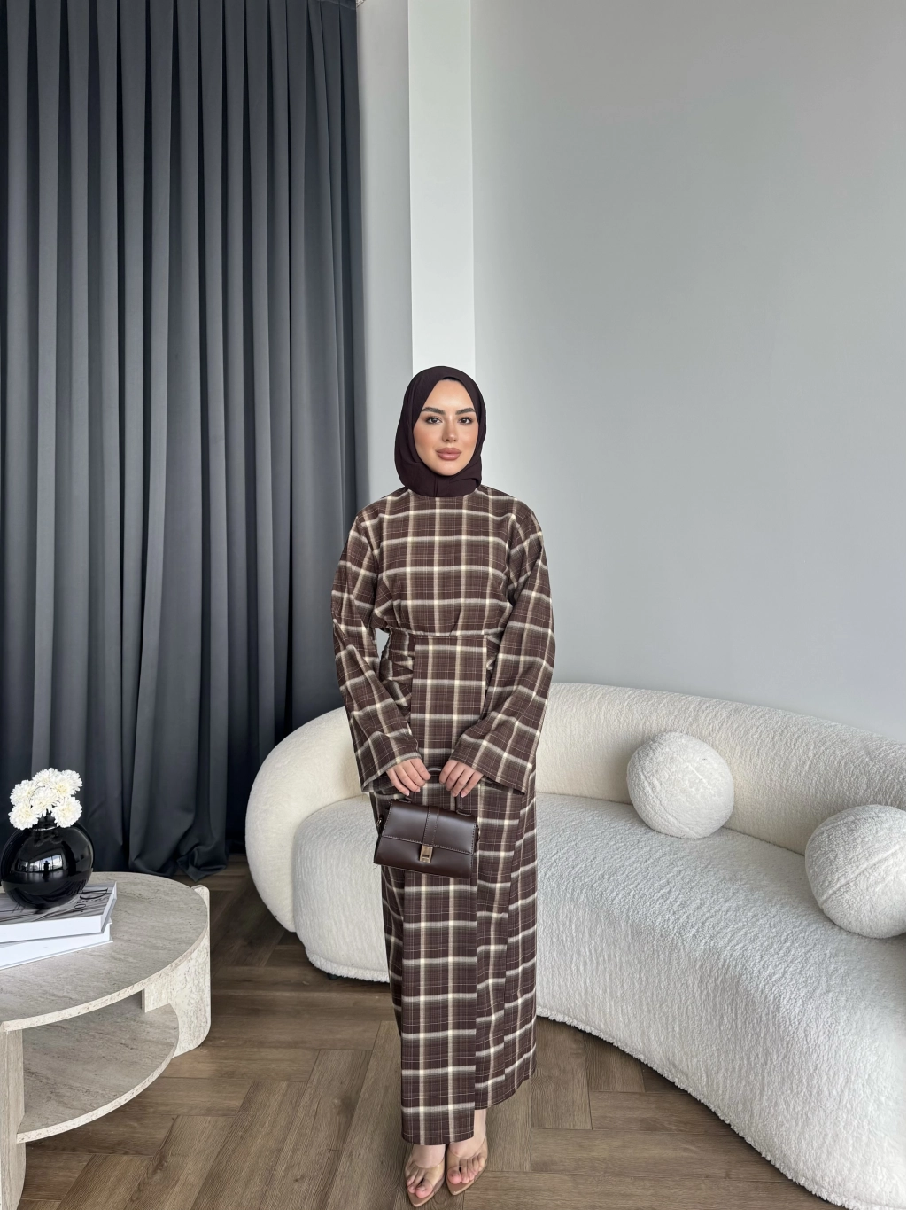 Qu - Carmen Kareli Etekli Takım - Koyu Kahve