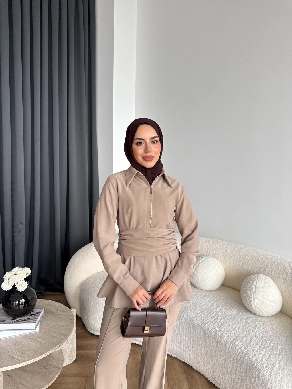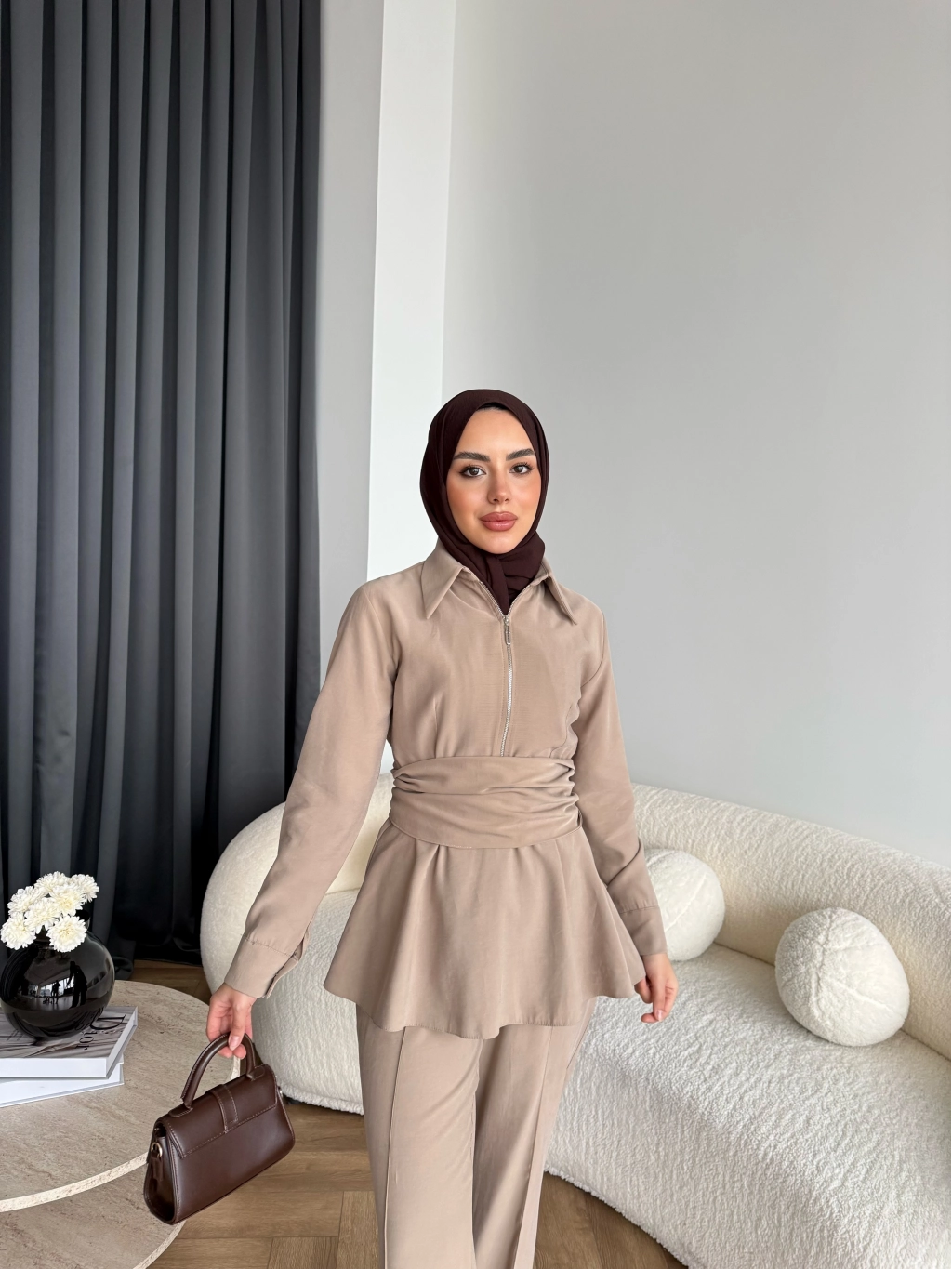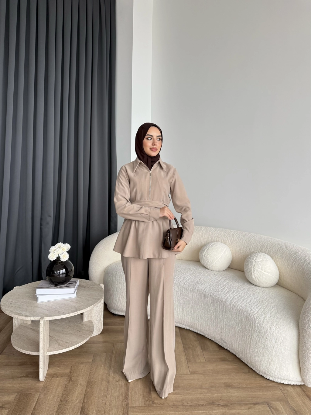 Qu - Hally Atkı Detay Modal Takım - Bej