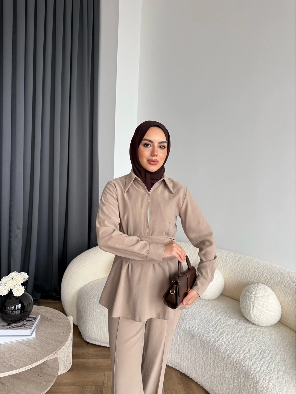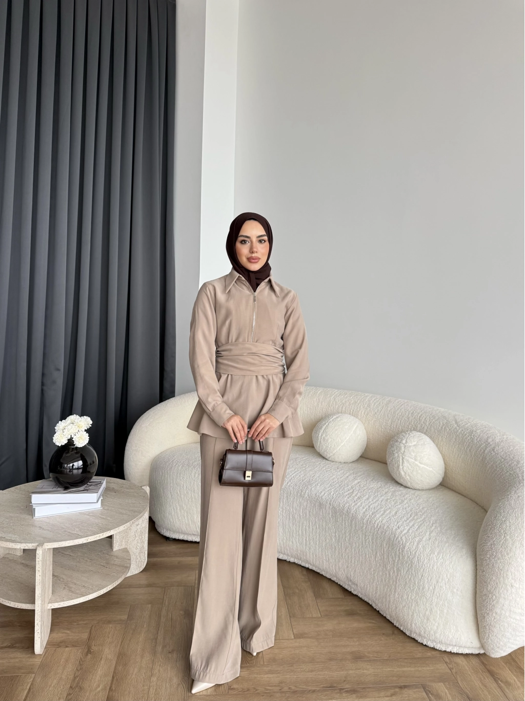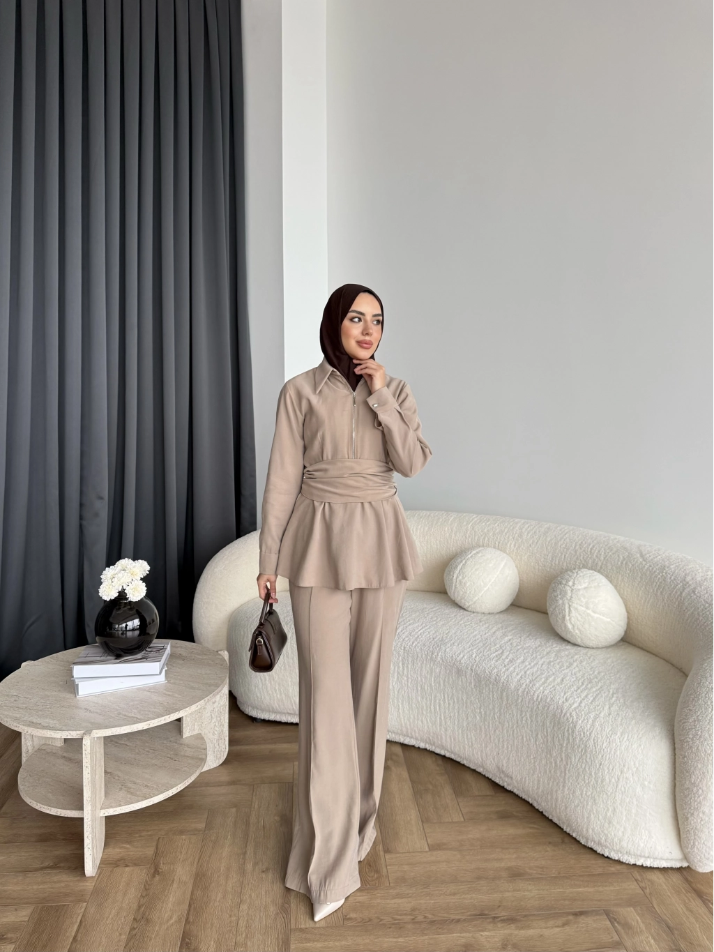 Qu - Hally Atkı Detay Modal Takım - Bej