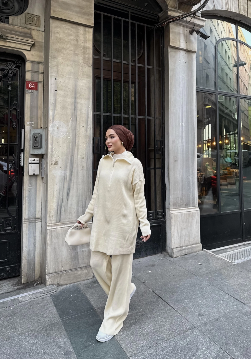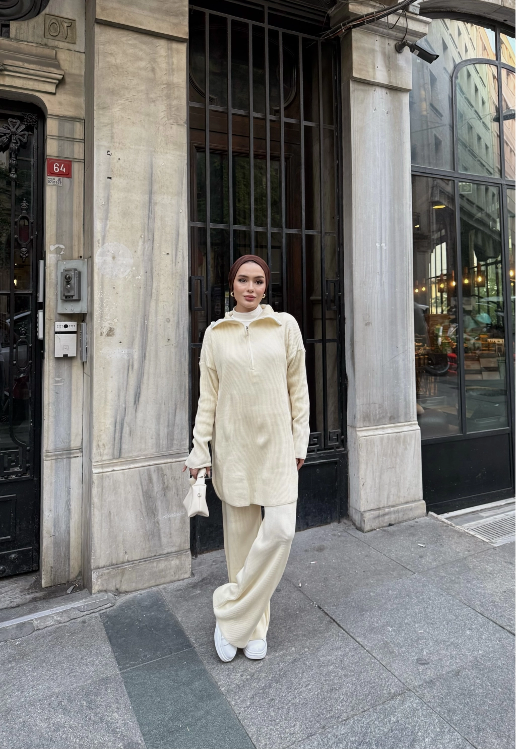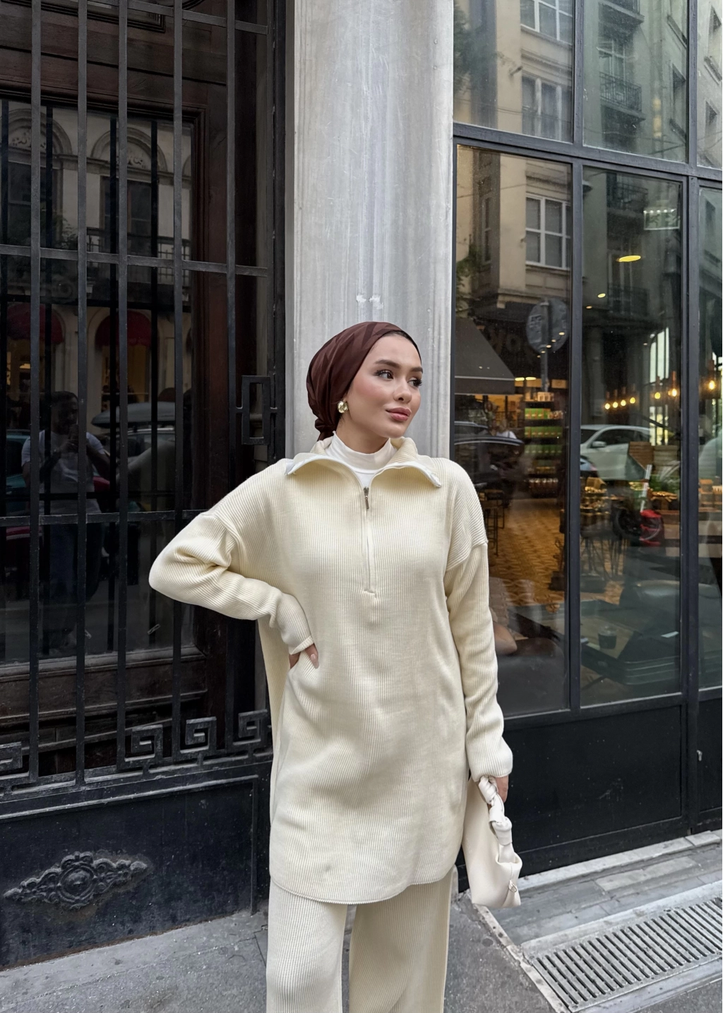 Sonbahar/kış sezonunda tercih edilen triko kumaştan üretilmiştir. Ön kısmı fermuarlı ve Salaş bir kalıba Sahiptir Pantolon beli lastikli dir