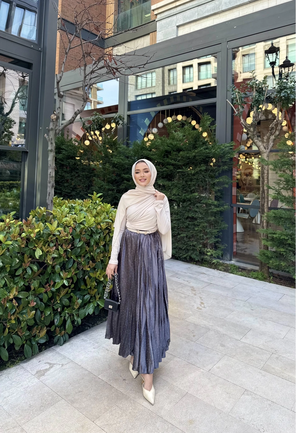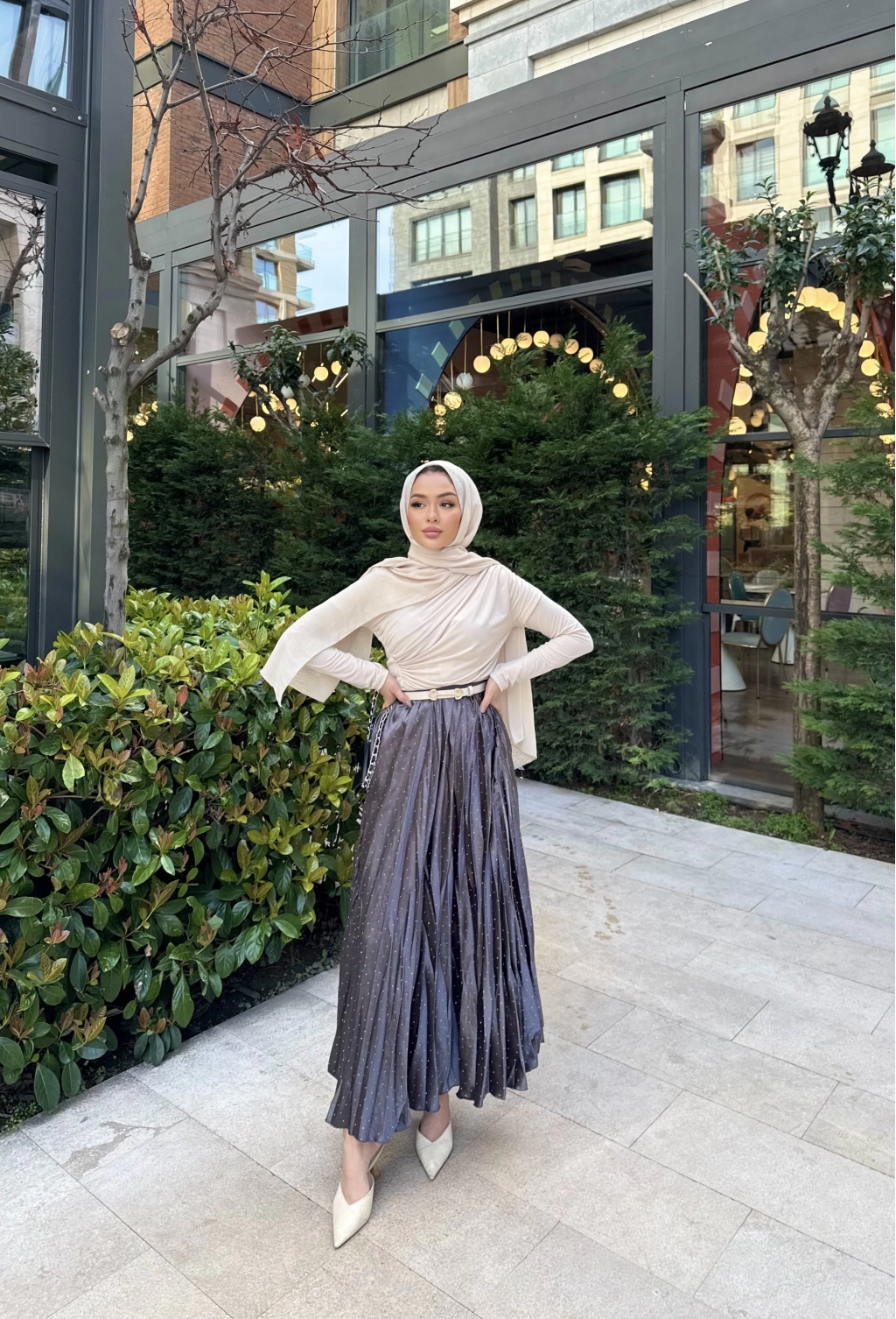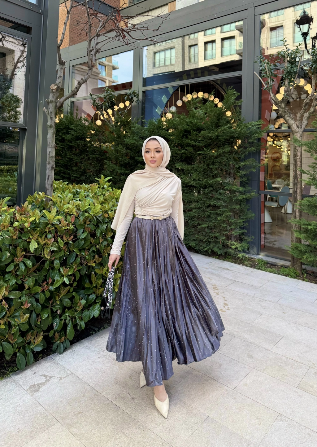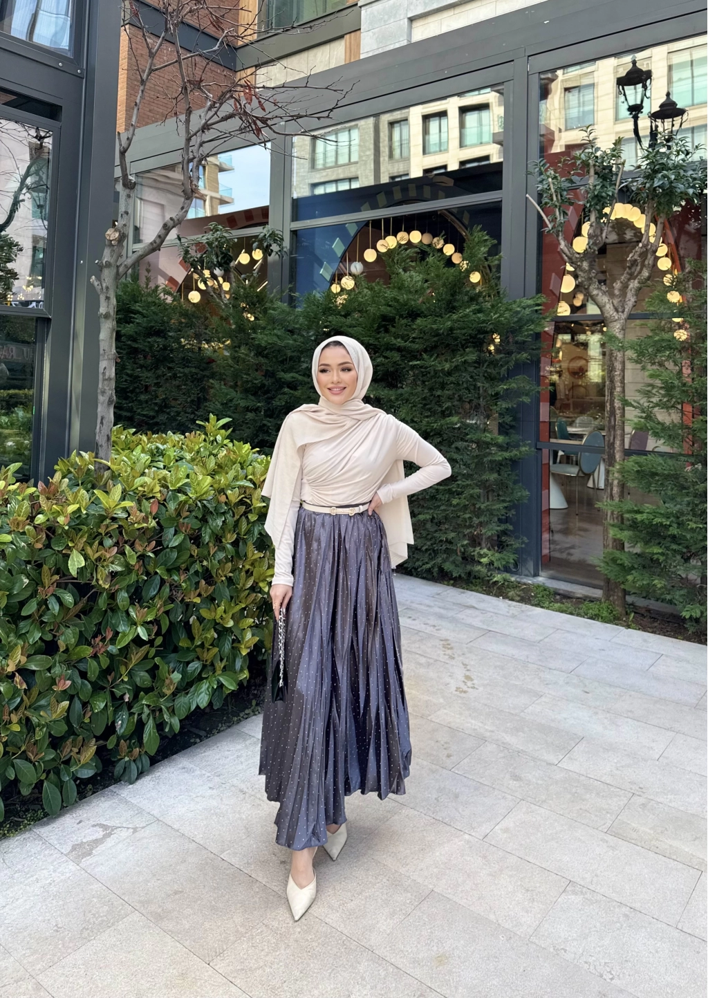 Taşlı Saten Etek - Gri