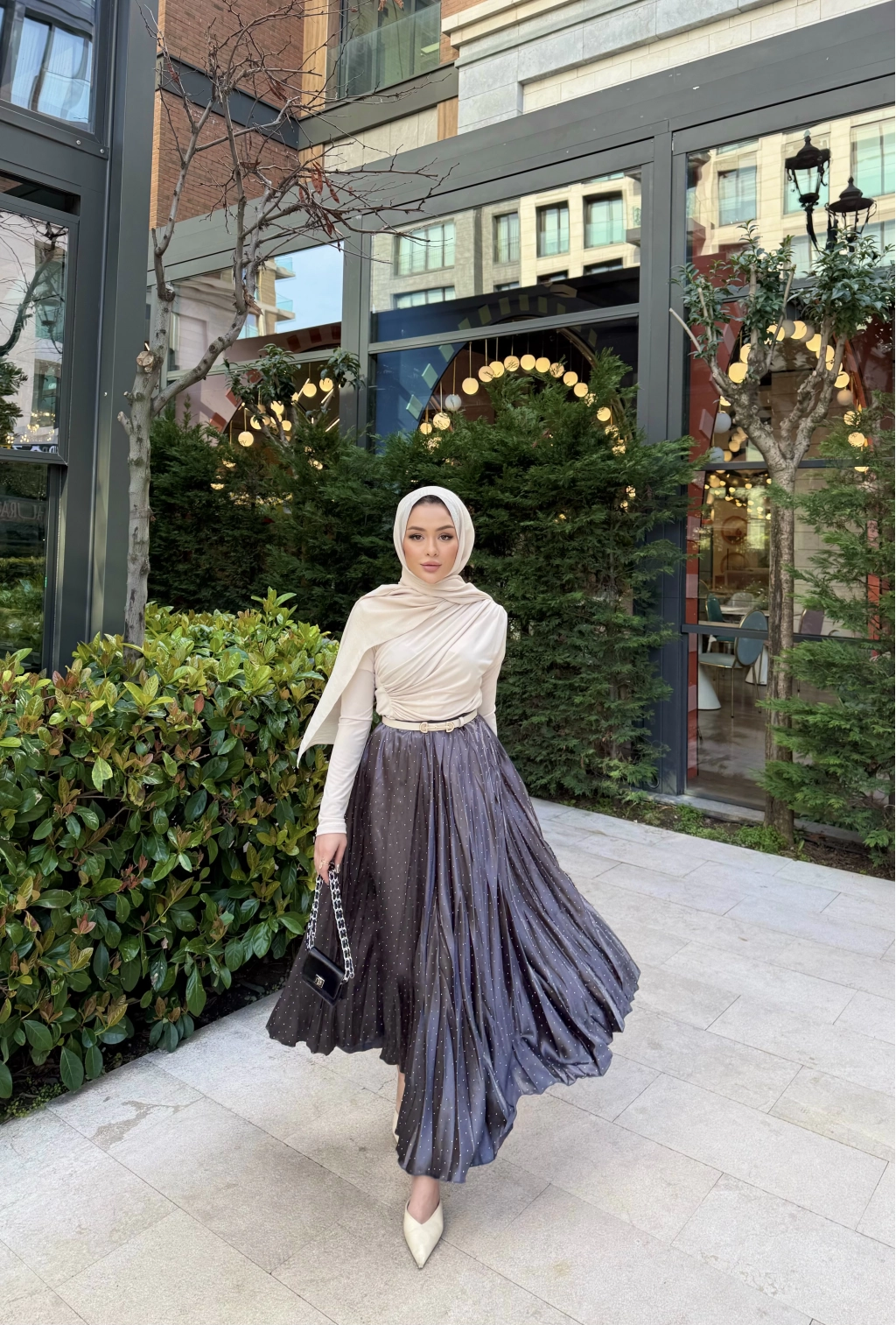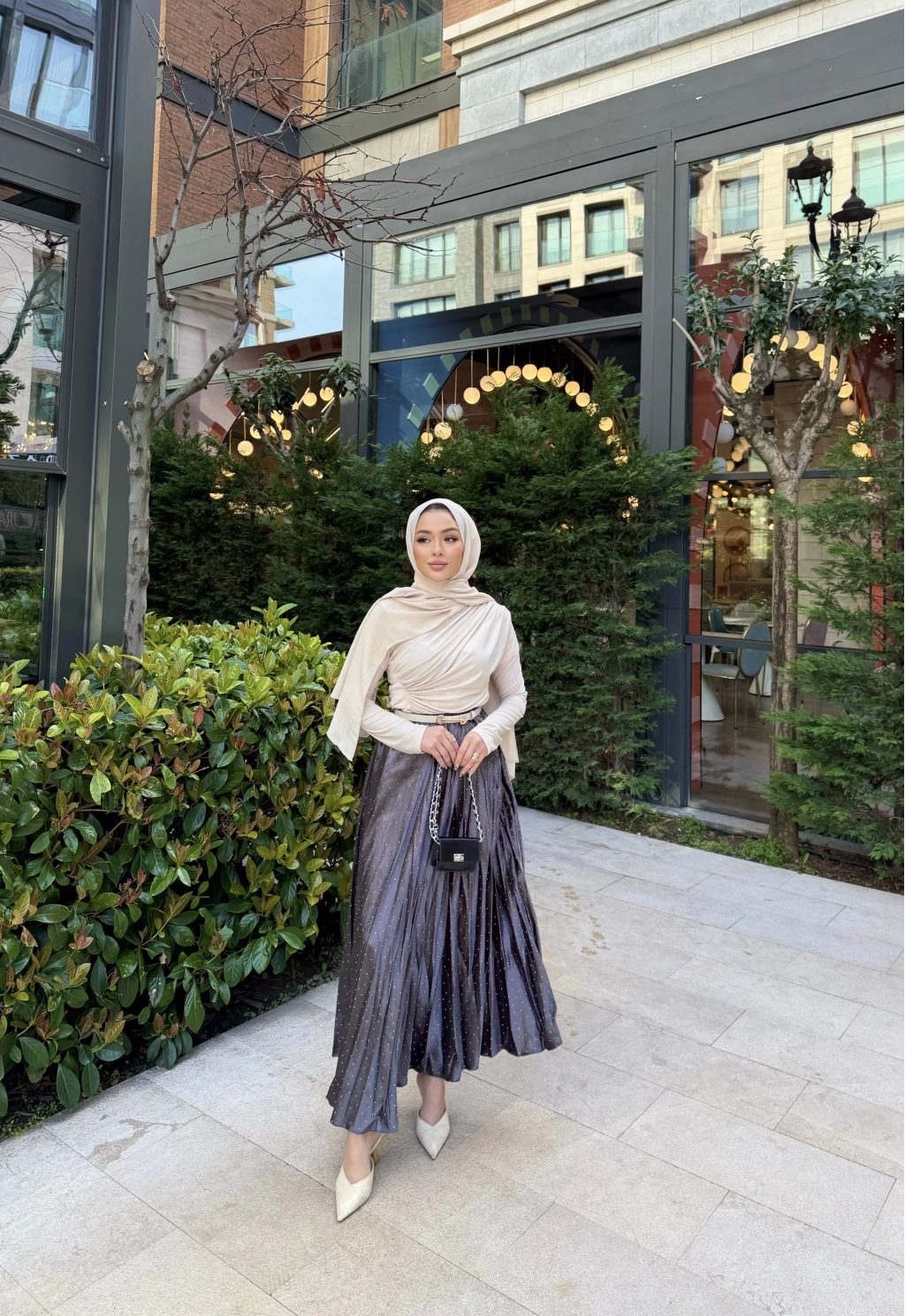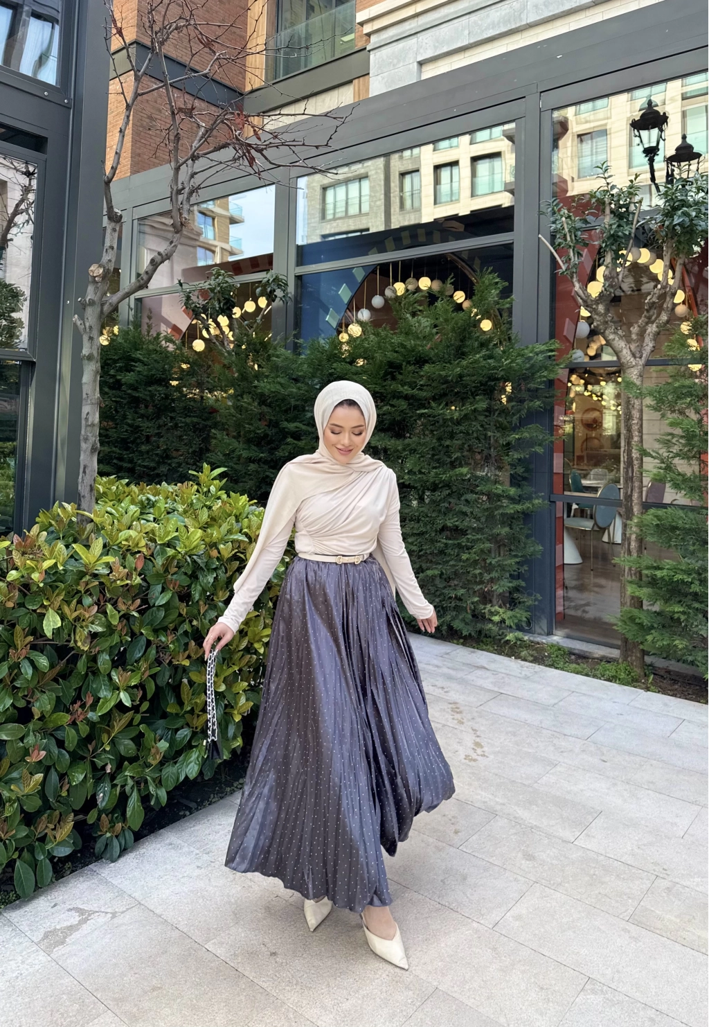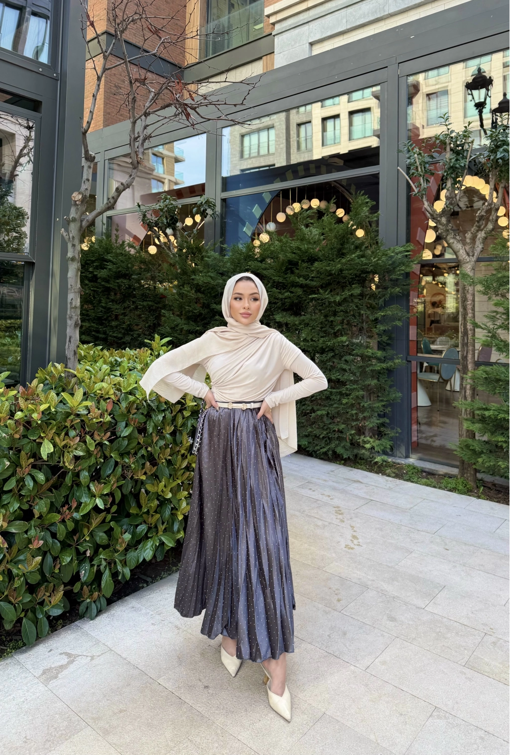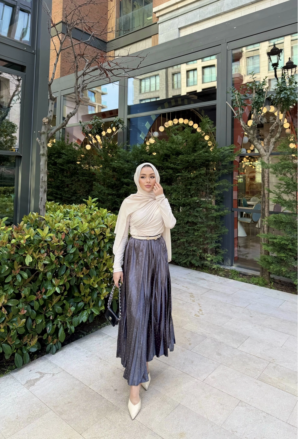 Taşlı Saten Etek - Gri