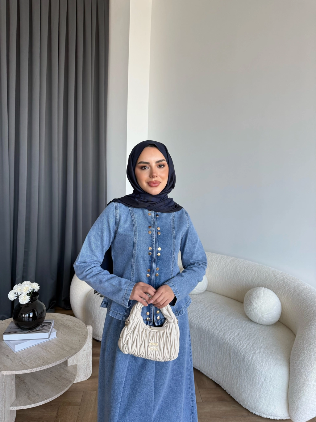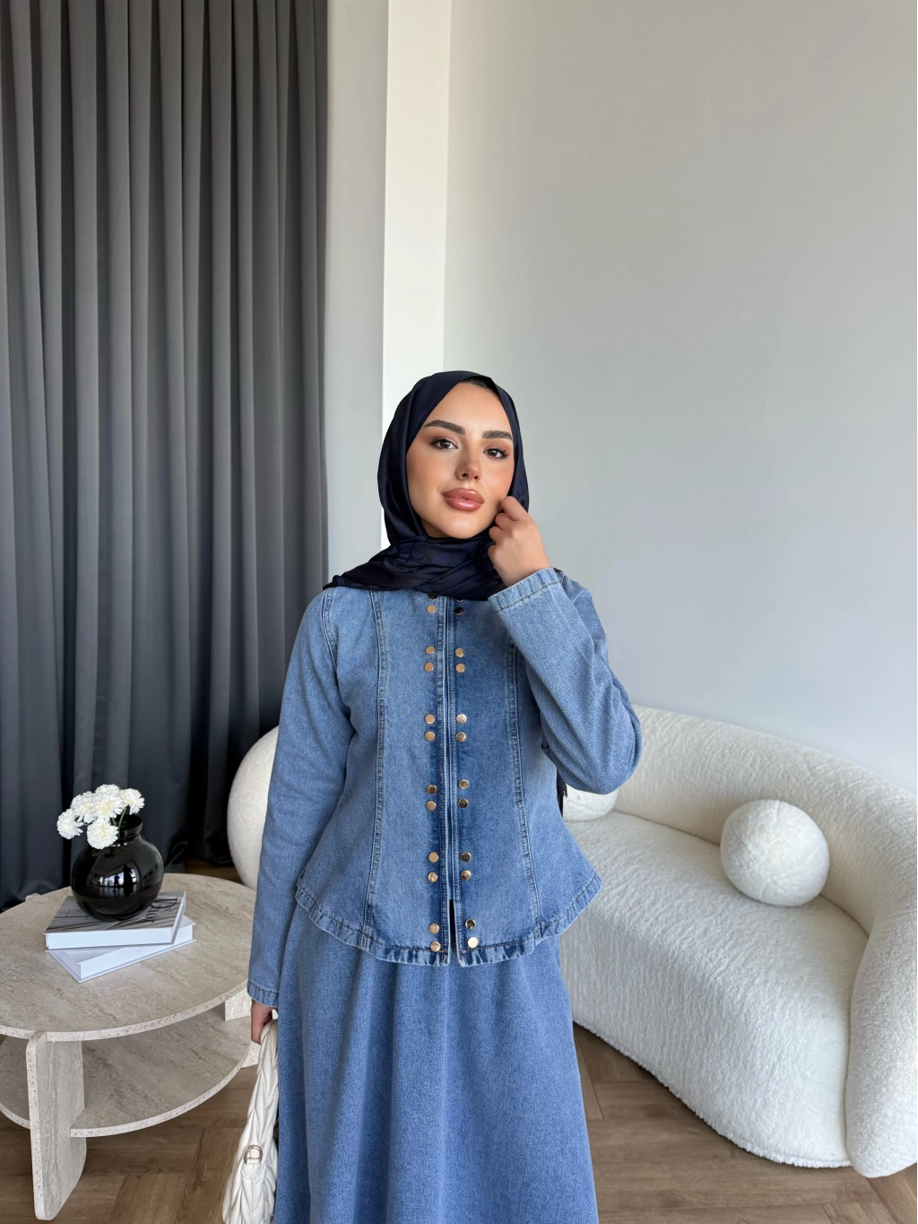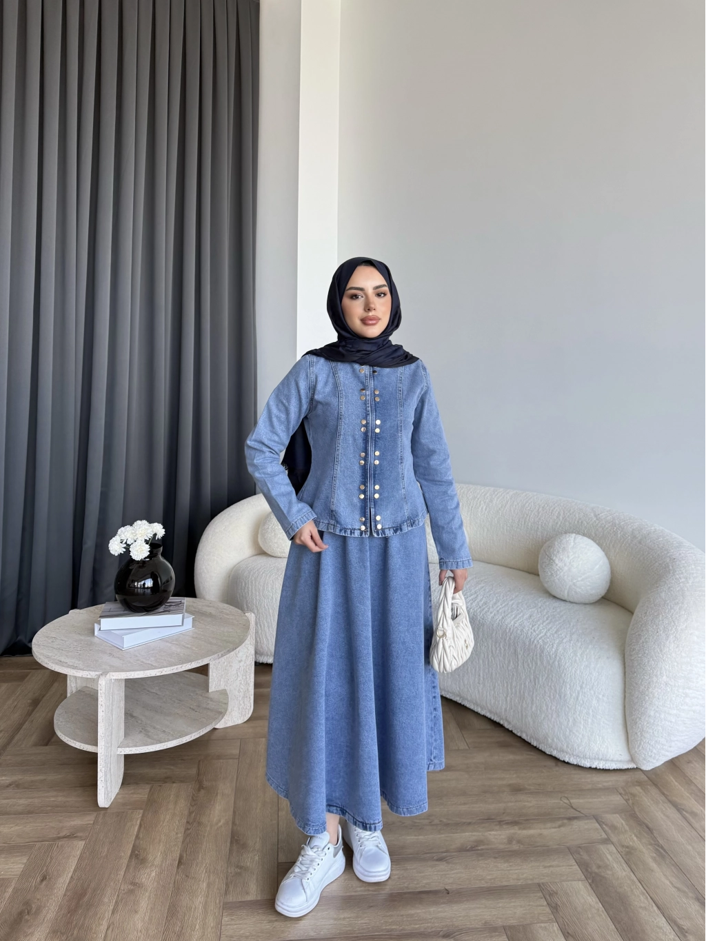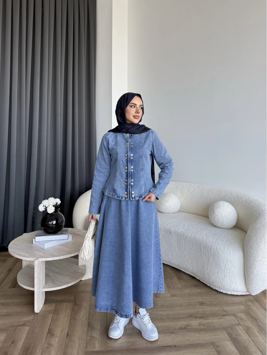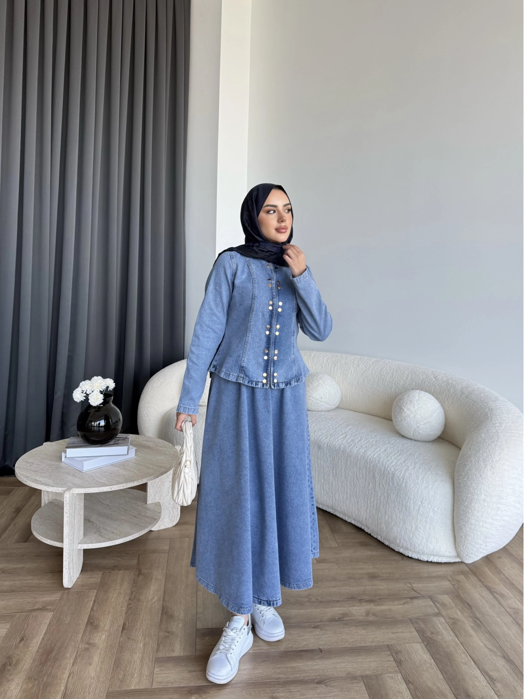 Tb - Çıtçıtlı Etekli Denim Takım - Açık Mavi