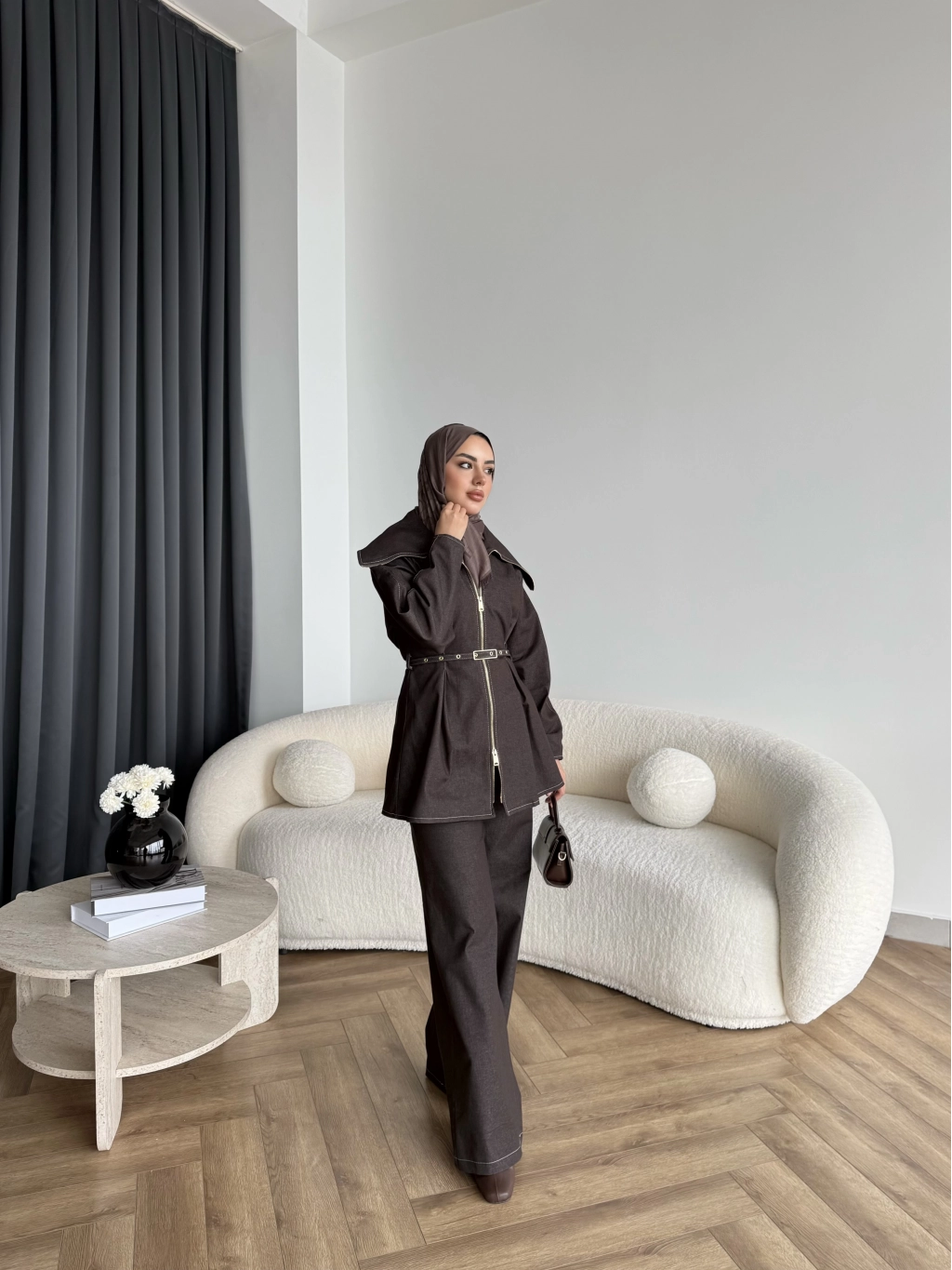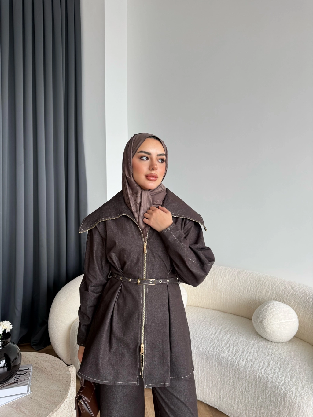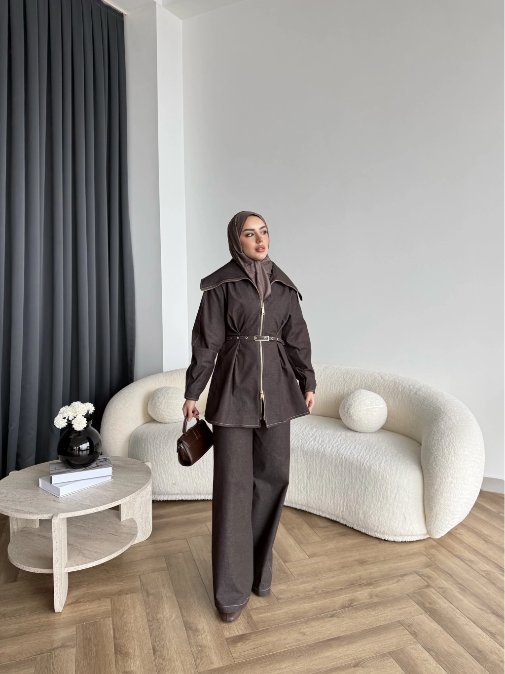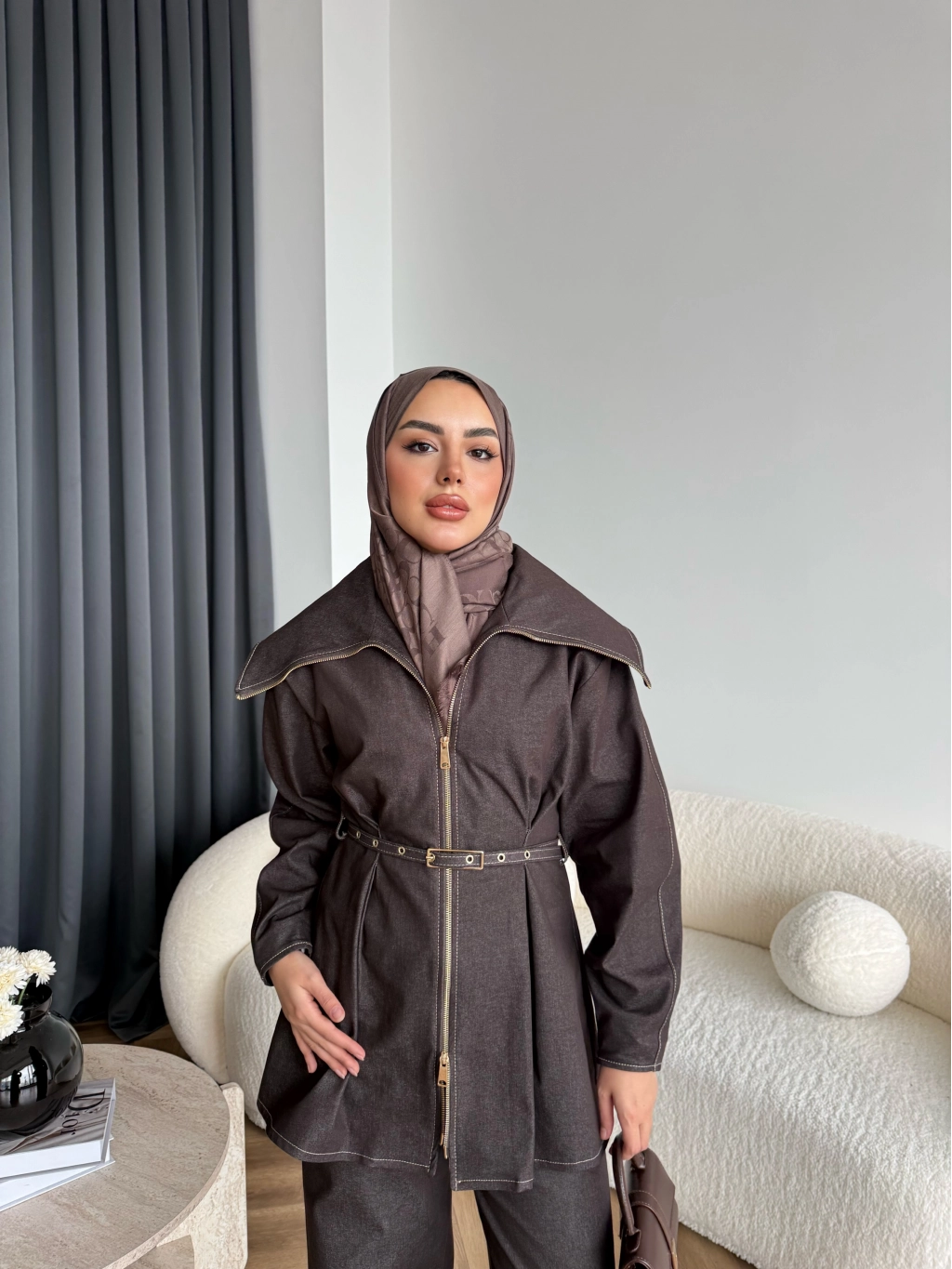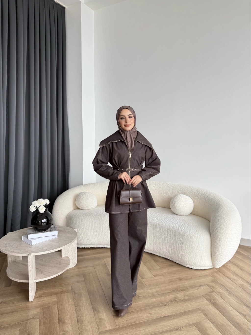 Tb - Selny Fermuarlı Kemerli Kot Takım - Kahve