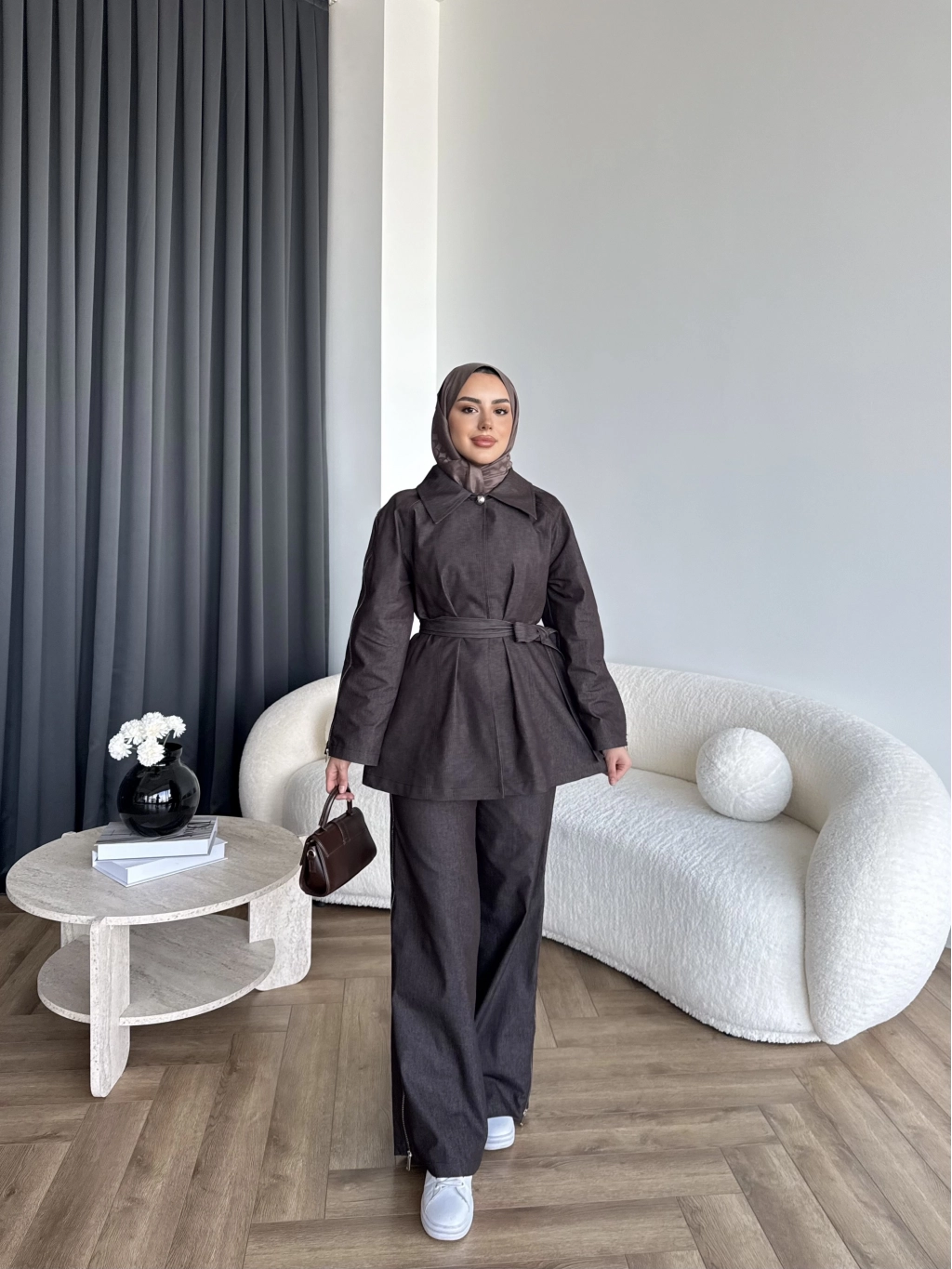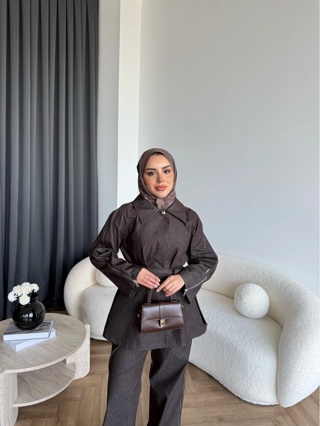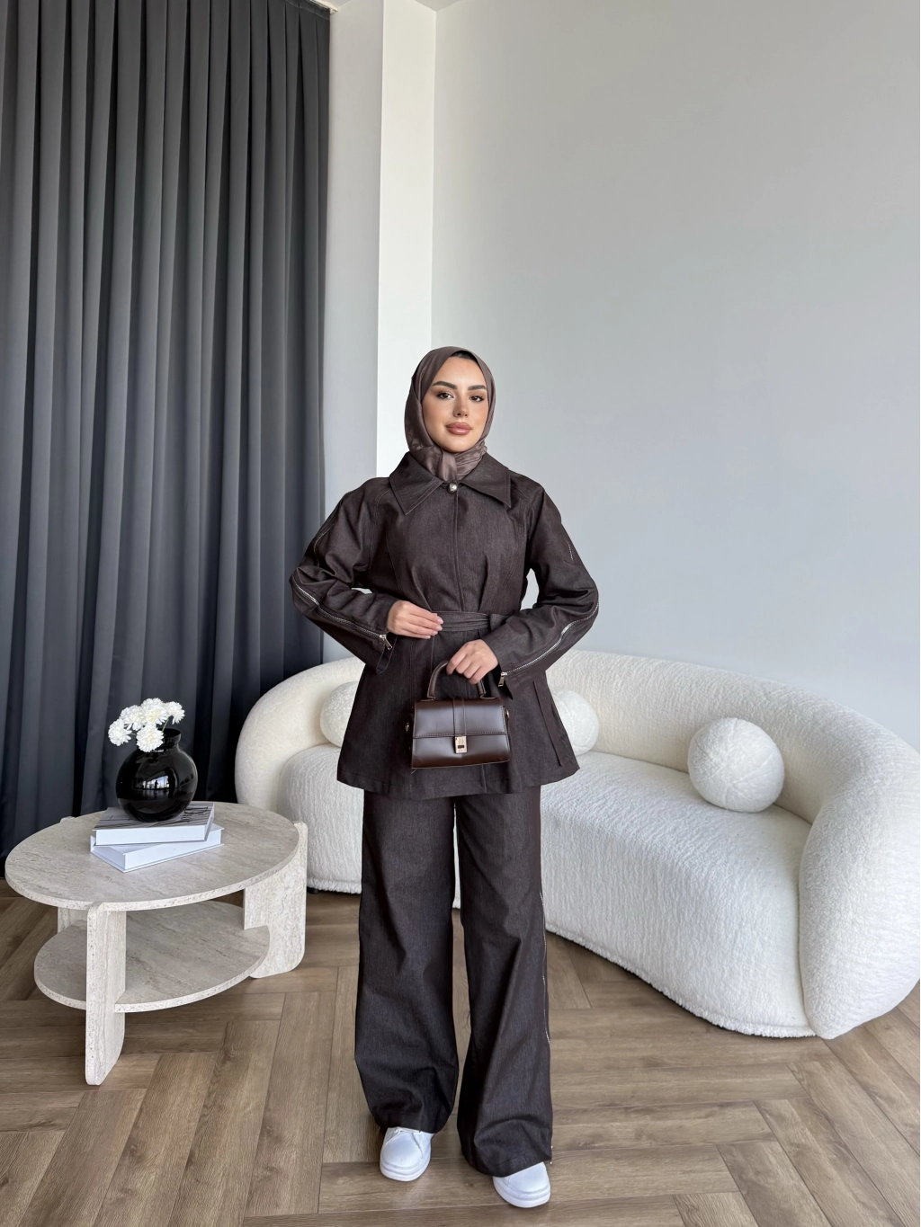 Tb - Yan Fermuar Detay Denim Takım - Kahve