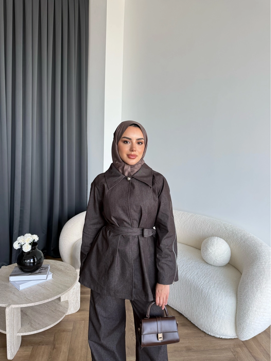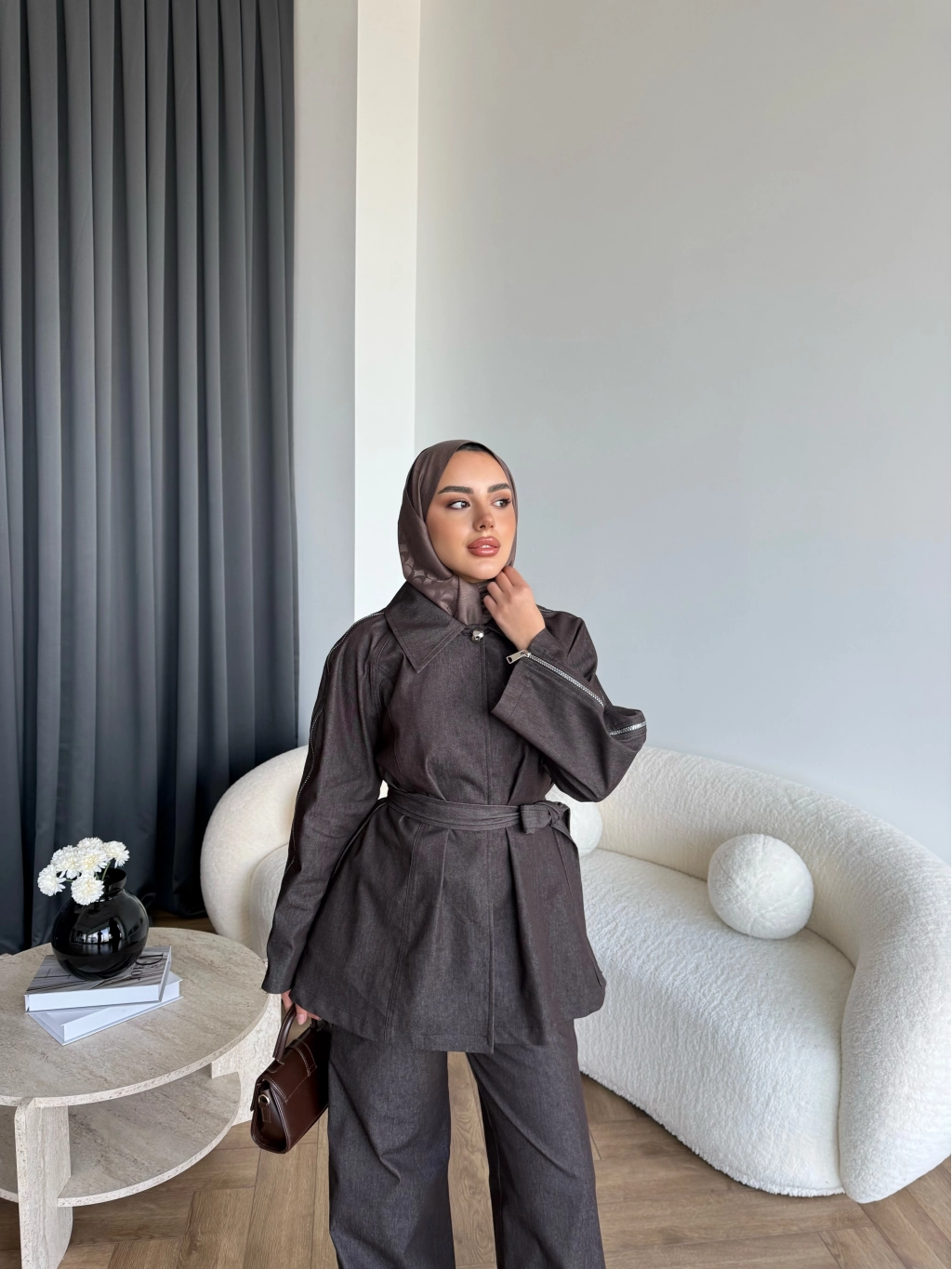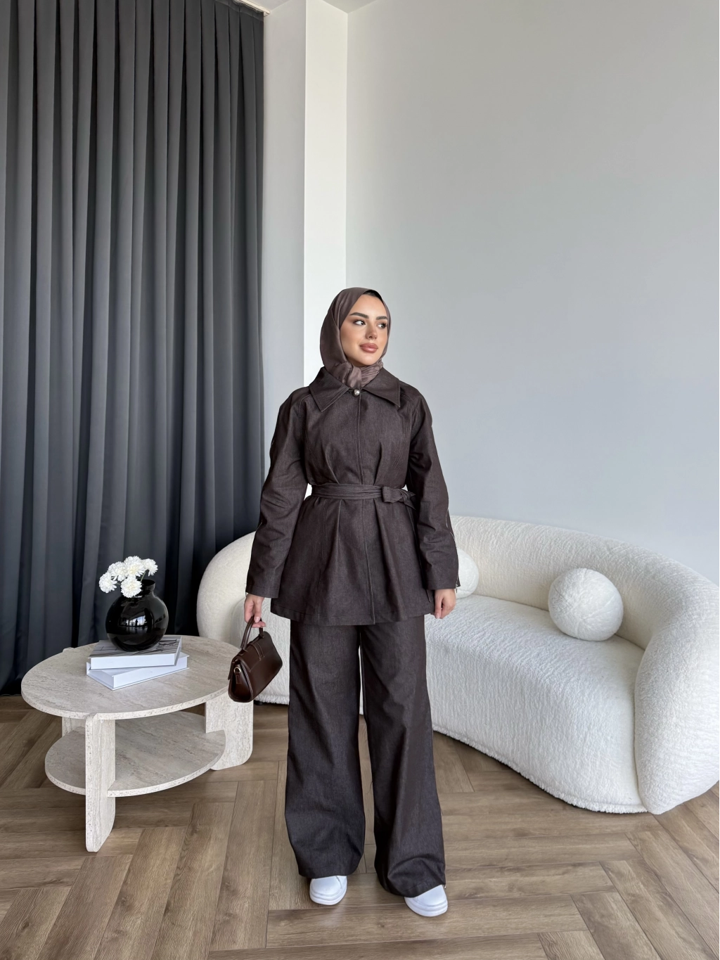 Tb - Yan Fermuar Detay Denim Takım - Kahve