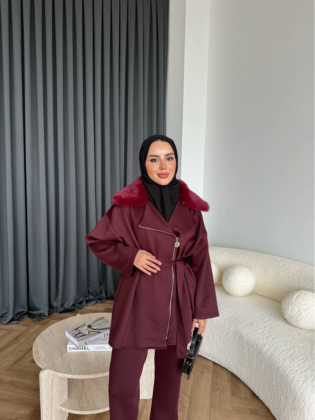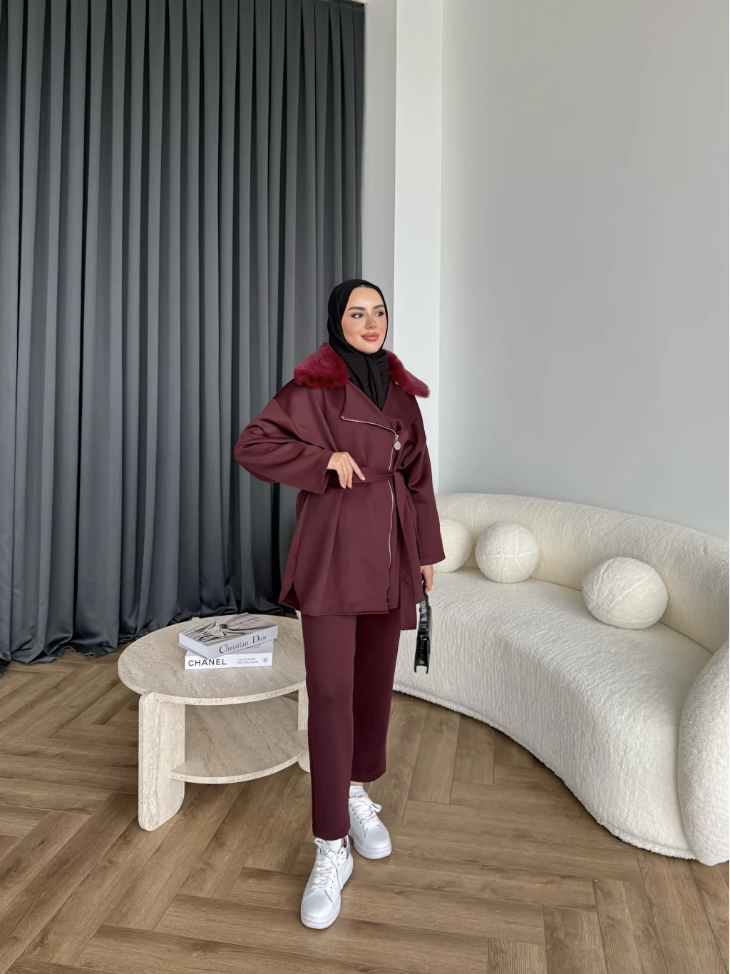 Vare Yakası Kürklü Scuba Takım - Bordo