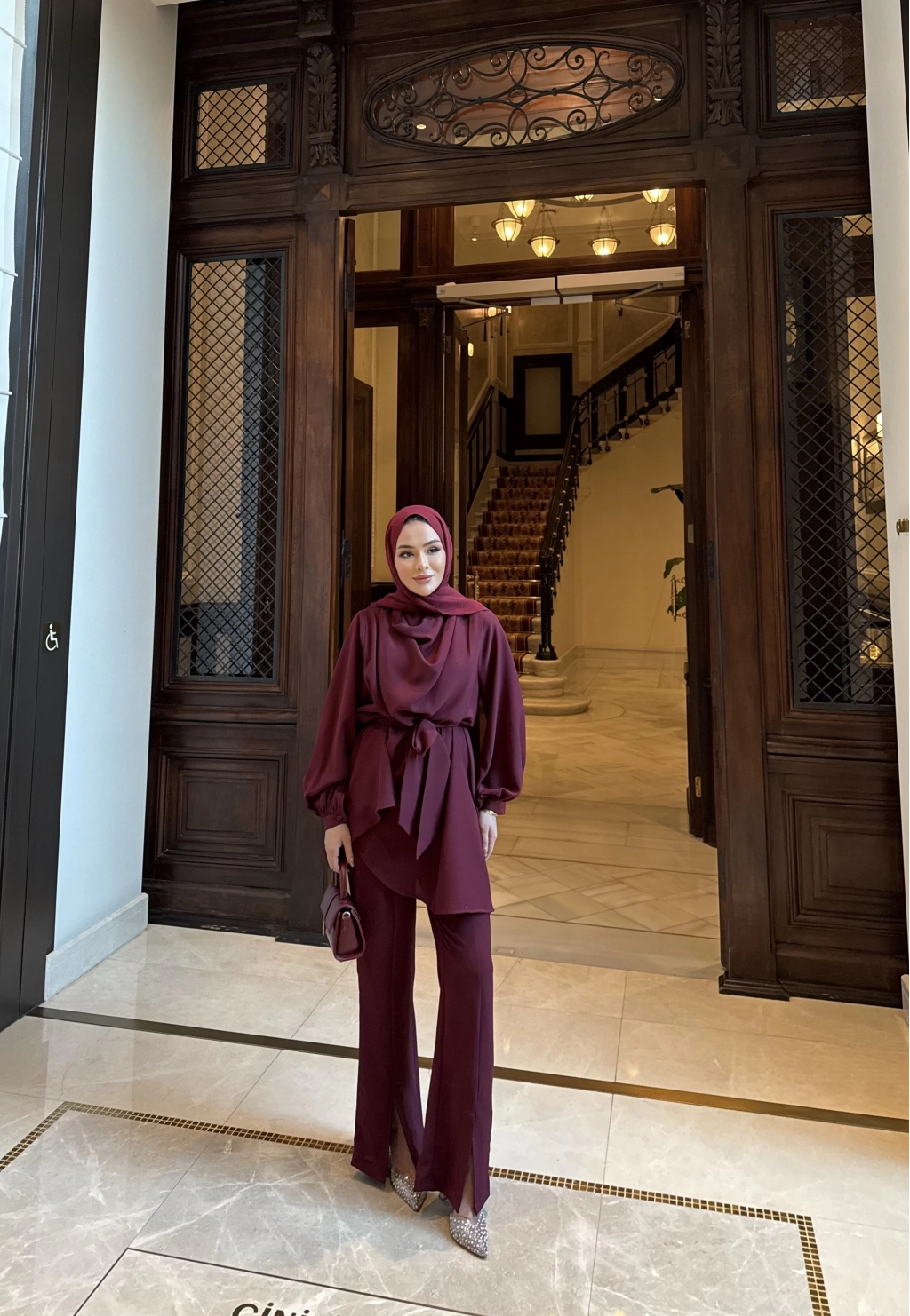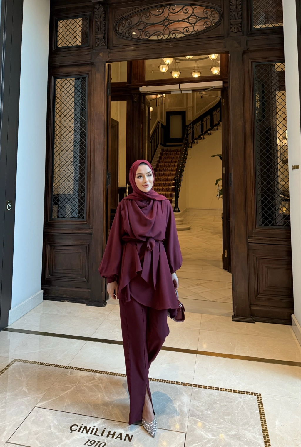 Krep kumaştan üretilen takımın seyyar kemerlidir , belinde seyyar kuşağı mevcuttur. Pantolon beli lastiklidir,
