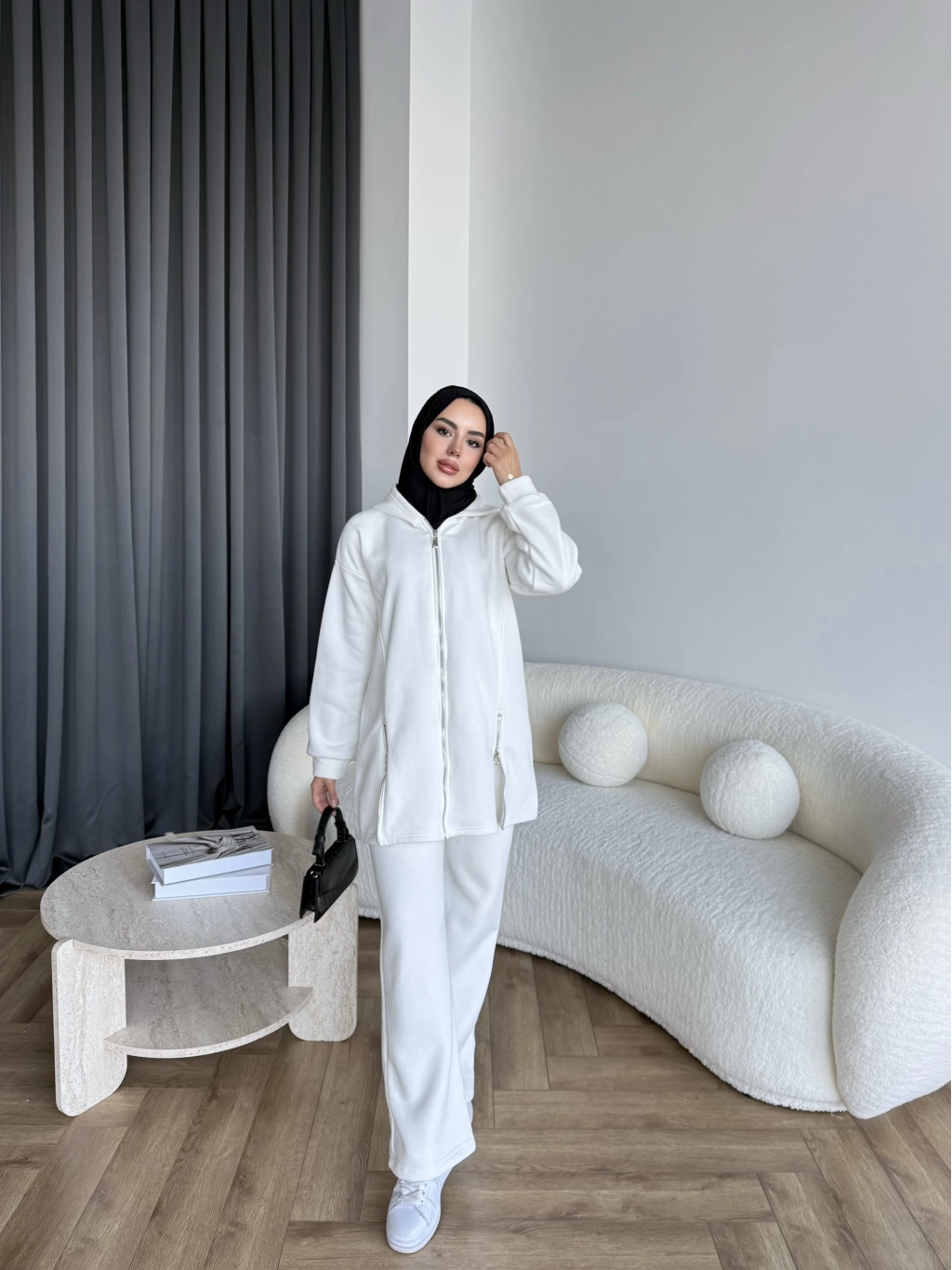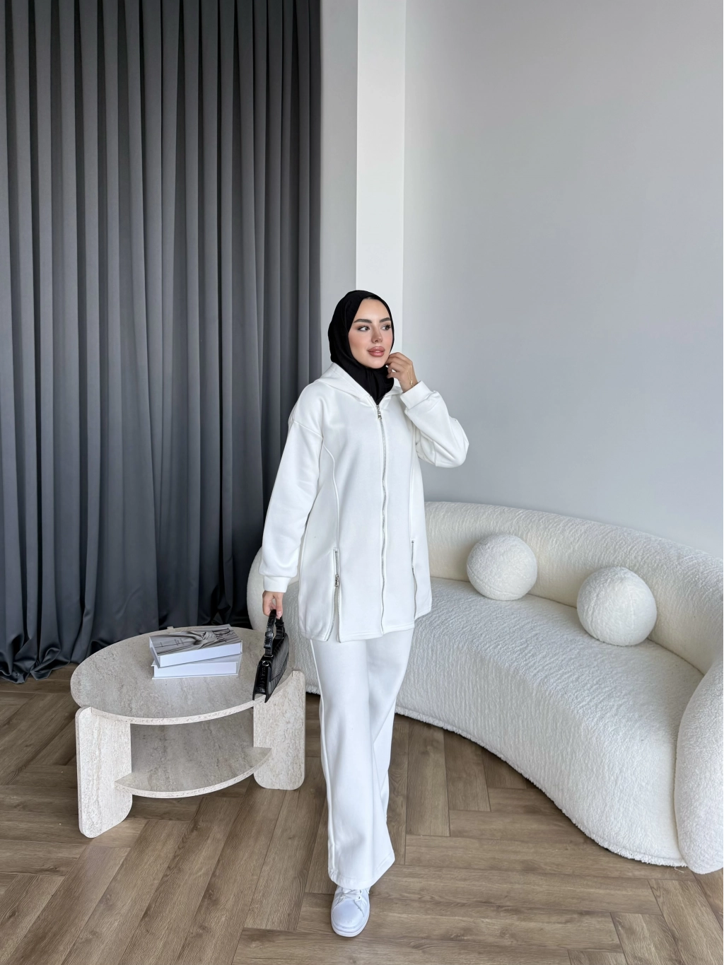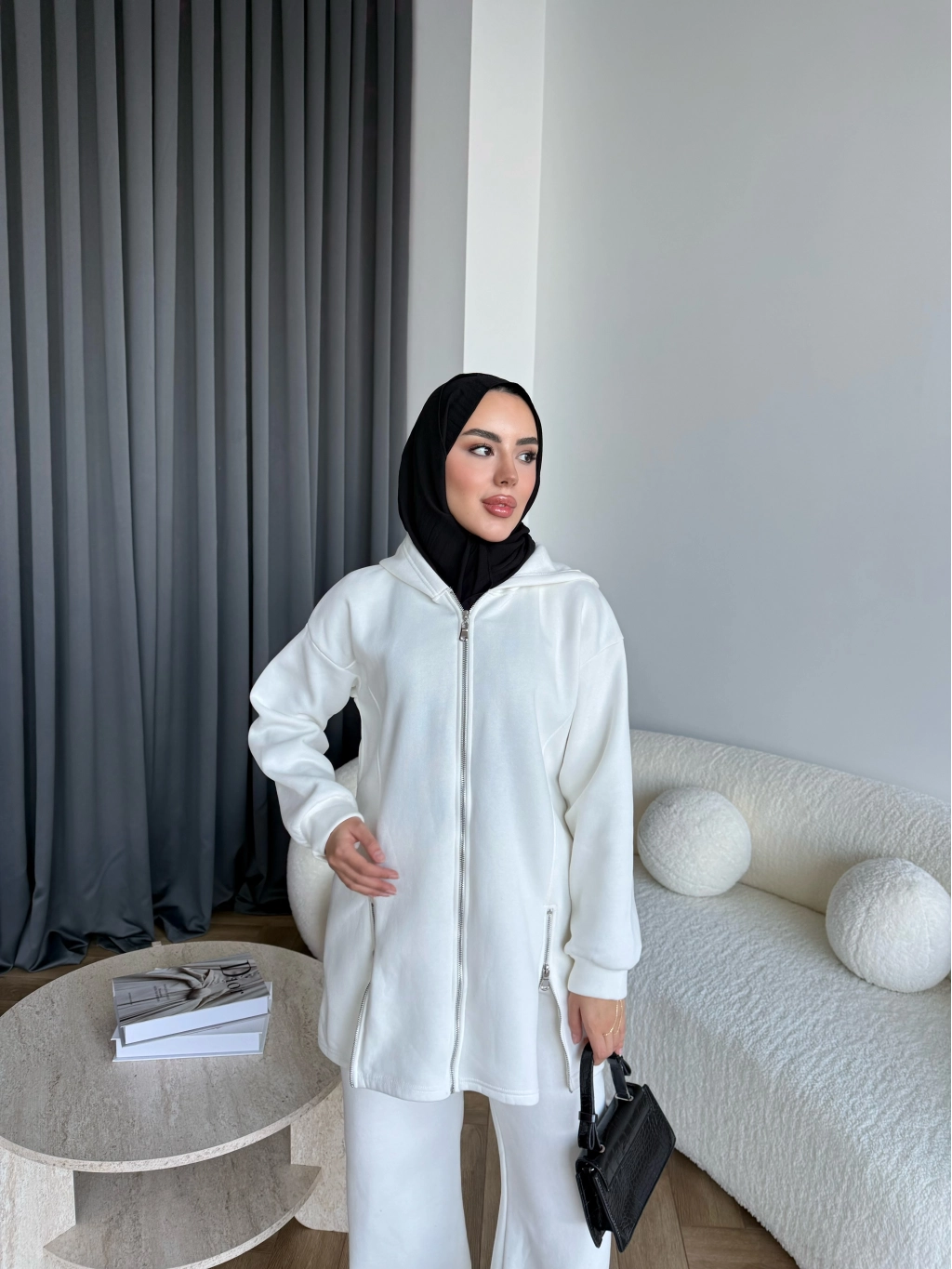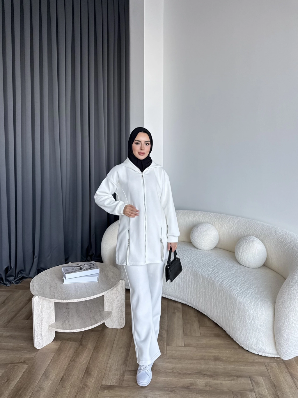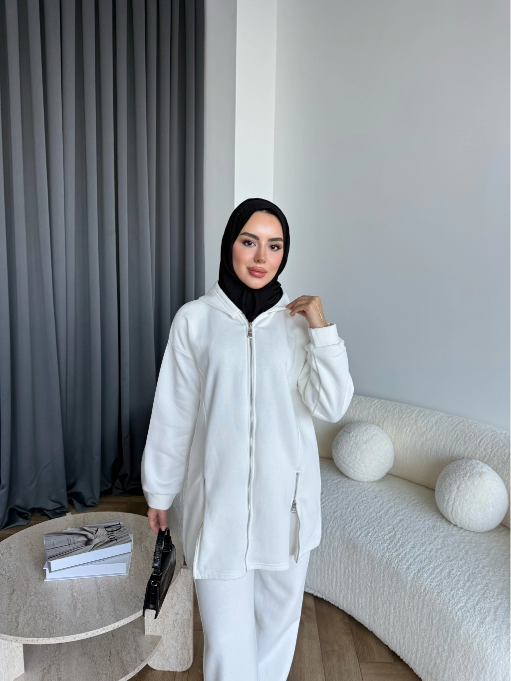 Yan Fermuarlı 3 İplik Takım - Beyaz